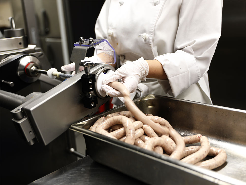 破れたり余分な空気が入ったりしないよう慎重かつ丁寧に作業を行うことで、透明感のある腸にぎゅっと詰まった肉の旨みを閉じ込めていきます。