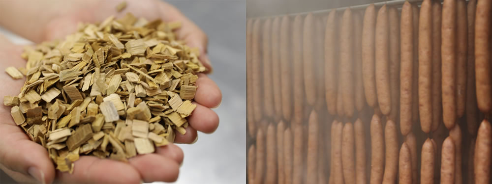 当店で使用しているスモークチップは、やや甘みを含んだ芳醇な香りを出すのが特徴です。スモーキーさの中に上品さがあり、素材の風味を引き立てます。白い煙がソーセージをやさしく包みこむと、時間の経過に伴い薄いピンクだった皮が飴色に染まり、艶やかに輝いて行きます。この甘くて香ばしい燻香が後を引く美味さを演出します。